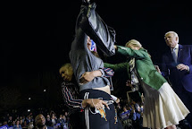 from arriving on stage during an primary night rally in the Baldwin Hills